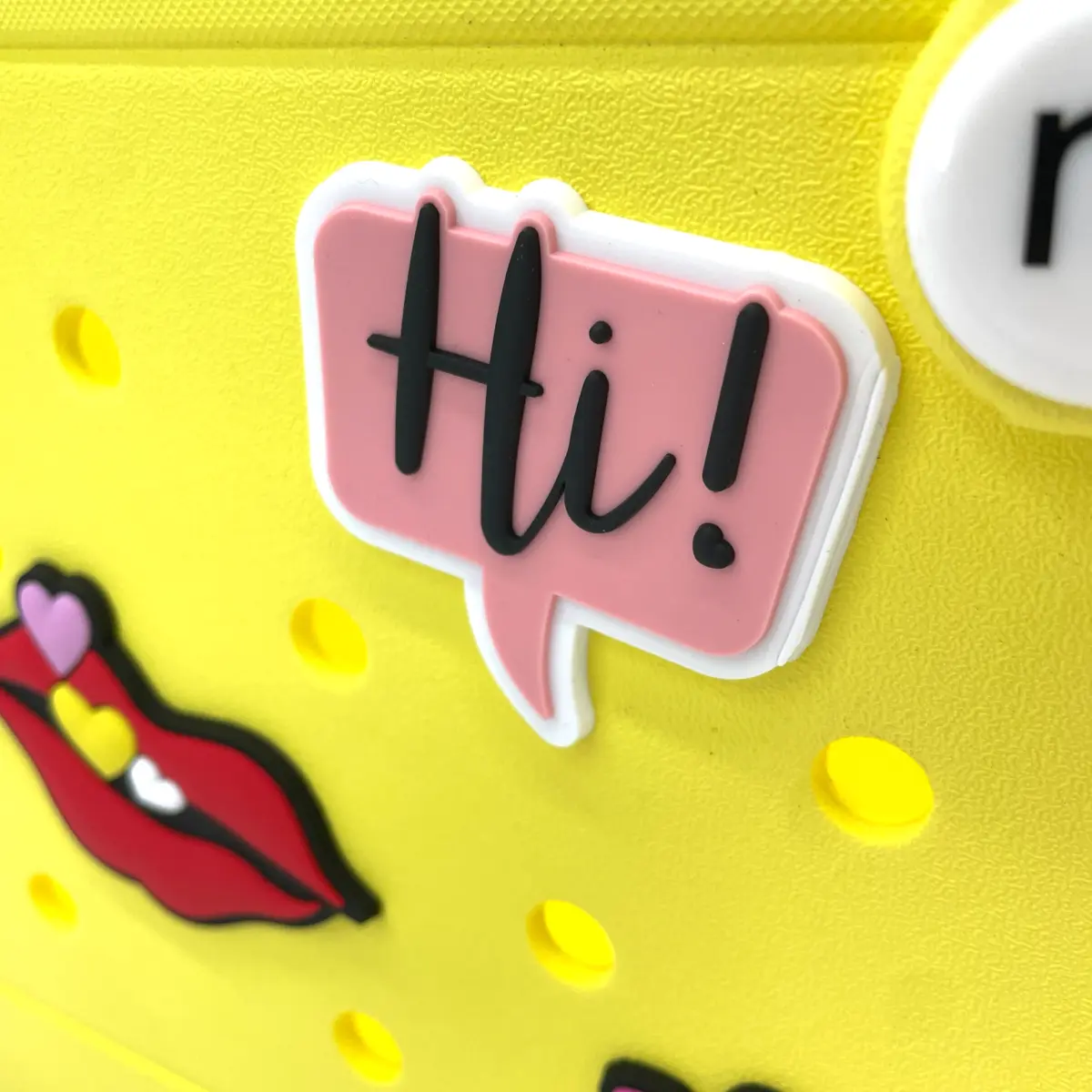 Dobd fel a táskádat ezzel a barátságos Muhm Charm – Hi! felirattal! A rózsaszín beszédbuborékban található fekete felirat azonnal magára vonzza a figyelmet és vidám, pozitív hangulatot kölcsönöz. Legyen szó baráti találkozóról, munkahelyi napokról, vagy hétvégi kiruccanásokról, ez a charm tökéletesen kifejezi közvetlen és mosolygós stílusodat. Egyszerűen rögzíthető bármelyik Muhm Bag táskához és könnyen kombinálható más charmokkal is a személyre szabott megjelenés érdekében!
