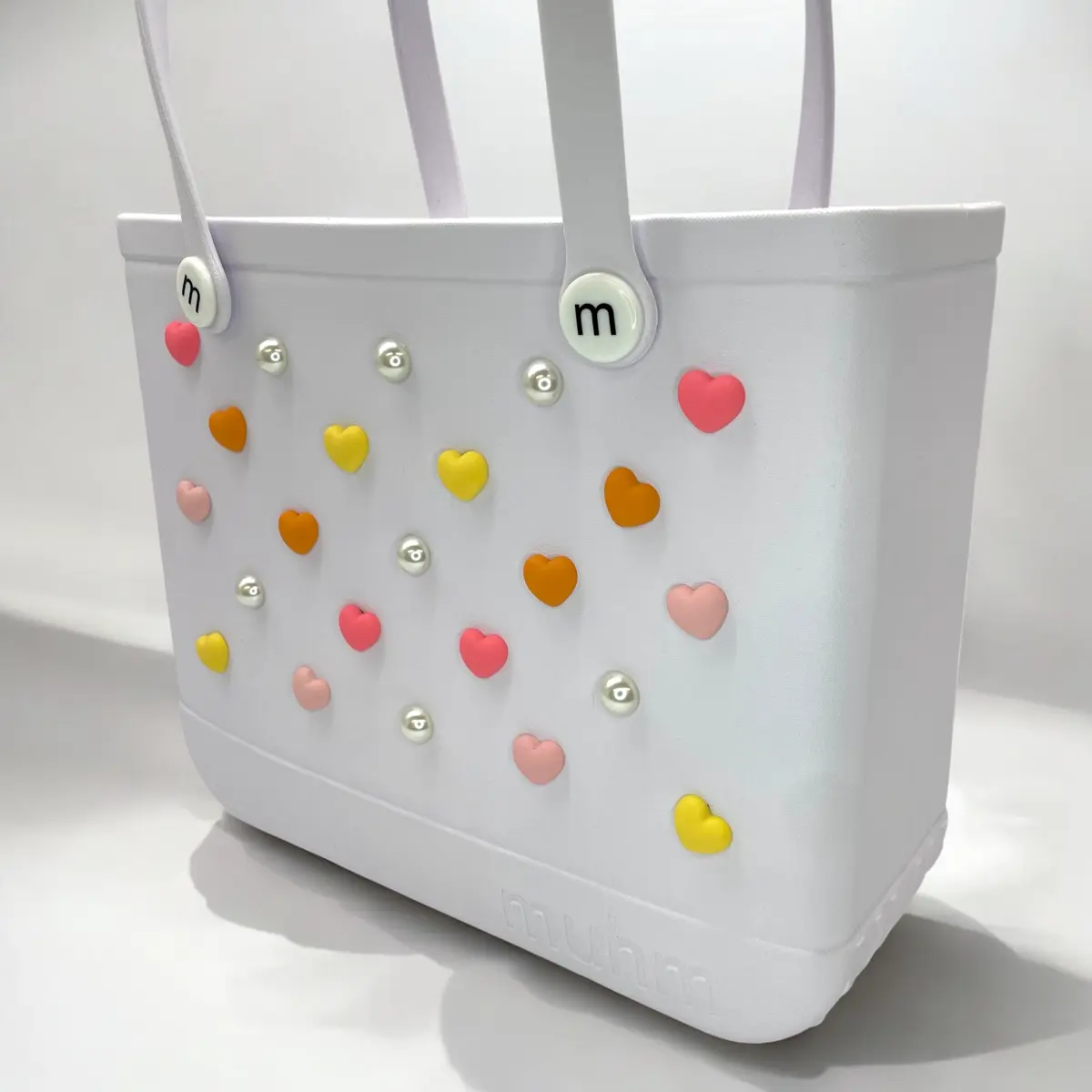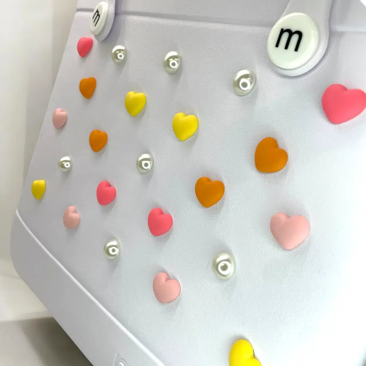 A „Muhm Gyöngy – szívek (meleg)” csomagja vidám és színes gyöngyökből áll, amelyek sárga, rózsaszín és narancs árnyalatokban pompáznak. Tökéletes választás, ha személyre szabnád a Muhm Bag táskád!