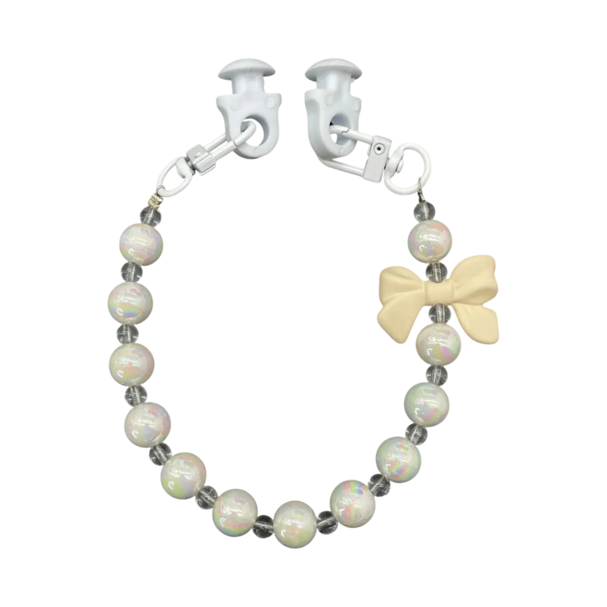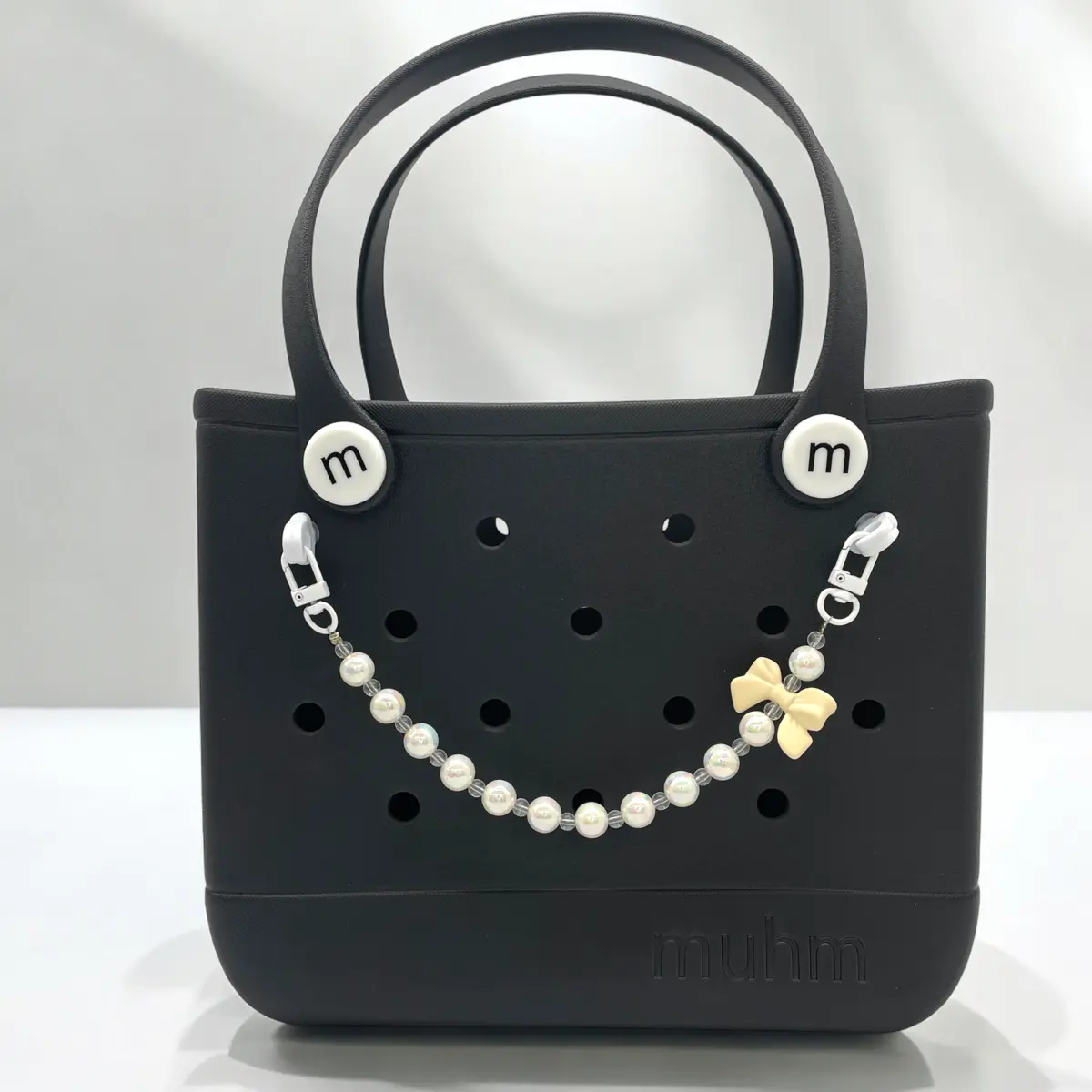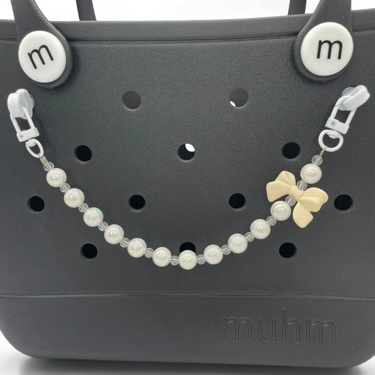 A „Muhm Lánc – krém masni” egyedülálló dizájnnal készült, amely finoman ötvözi a csillogó gyöngyöket és a letisztult, krém színű masnit. Ez a lánc tökéletes választás, ha eleganciát és egyediséget szeretnél kölcsönözni a Muhm Bag táskádnak.