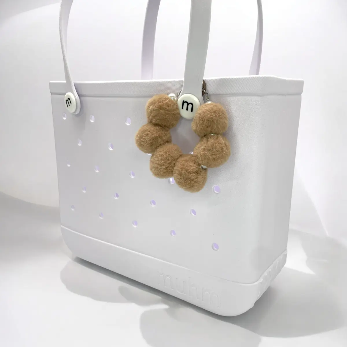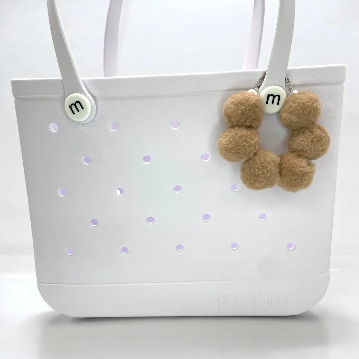 A barna Muhm Pompon puha és elegáns kiegészítő, amely stílusos megjelenést kölcsönöz a Muhm Bag táskádnak. Könnyen rögzíthető és különleges textúrát ad a táskádnak.